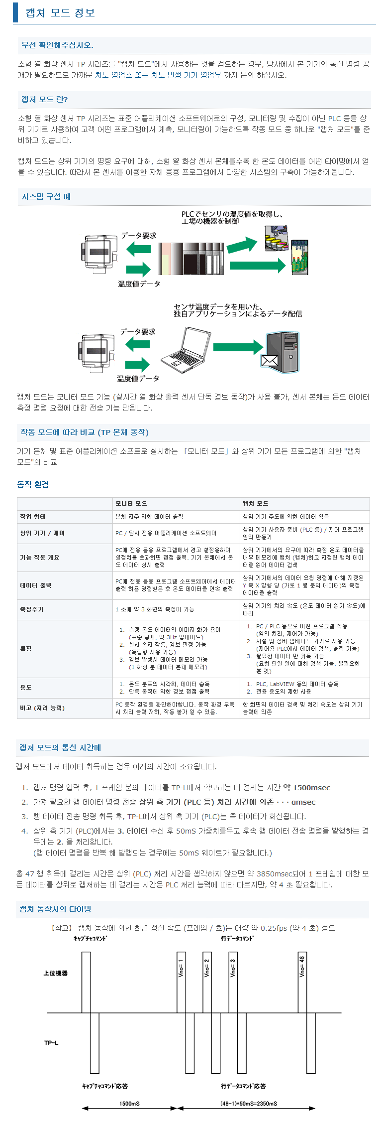 1. 캡처 명령 입력 후, 1 프레임 분의 데이터를 TP-L에서 확보하는 데 걸리는 시간 약 1500msec