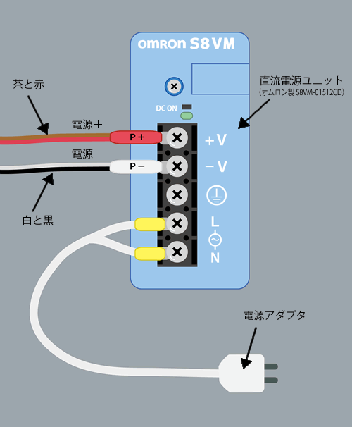 TP-L 전용 전원 케이블 별매의 직류 전원 공급 장치 (오므론 형식 S8VM-01512CD)의 결선 방법을 모르겠습니다.