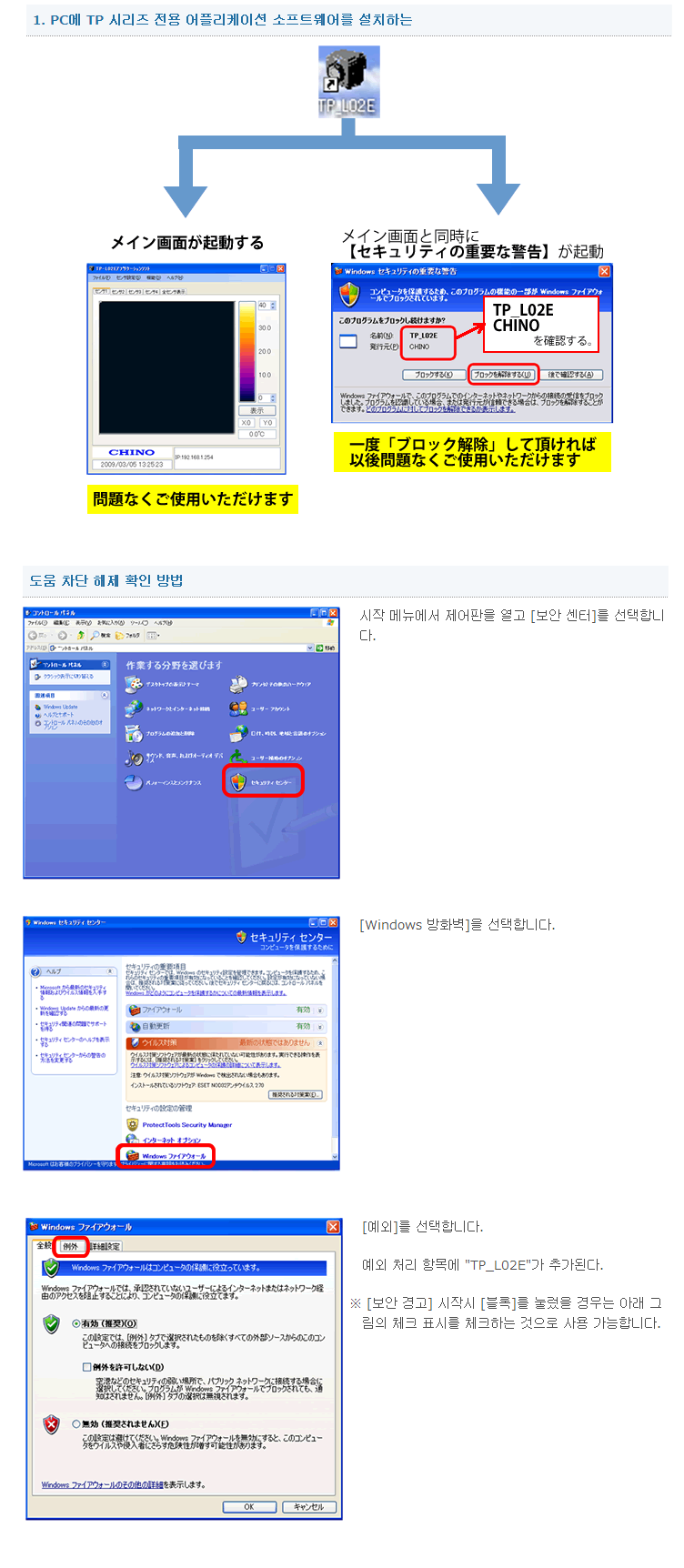 응용 프로그램 소프트웨어를 시작하면 "Windows 보안 경고"화면이 나온다.