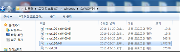 없다면 메일에 첨부된 MSVCR120D.zip 파일을 압축해제 하고 MSVCR120D.dll 파일을 해당 폴더에 붙여 넣는다.