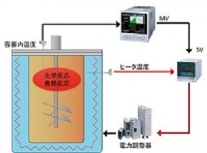 | 히터에 의한 가열과는 별도로 용기 내에서 물질이 화학 반응이 일어날때 발생하는 반응열이 용기 내의 온도를 상승시킬 수 있습니다.이러한 외란에 대한 제어성이 향상됩니다. | 온도 제어를 수행하기 위해 냉각수의 유량을 제어 할 수 있습니다. 이와 같이 온도 이외의 물리량을 이용하여 온도 제어를 할 경우에도 계단식 제어는 유효합니다. |