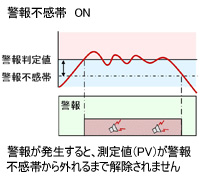 | 경보 불감대 | 측정치(PV)가 증감을 반복하고 있을 때, 경보의 발생과 해제가 자주 일어나는 것을 막는 기능.br>