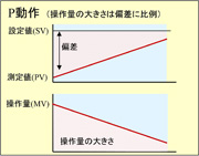 | 정 동작 | 측정 값 (PV) 증가 설정 값 (SV)에 가까워 질수록 제어 출력의 비율도 증가한다. 냉동기 등의 제어에 사용된다. |