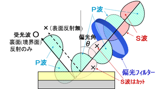 * 2 : P 파와는 Parallel polarization (평행 파)의 의미로 조사면에 평행 한 빛 (아래 그림에서는 종파)의 일을 가리 킵니다 광 간섭을 제거하는 방식이 P 편광의 빛 입사 각도와 반사율의 특성을 이용하여 간섭을 제거 가능합니다.