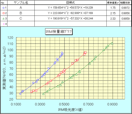 3 항의 ①, ②에서 구한 2 (수분 %, 두께 μ 용매 % · · etc)의 변화에 따라 증감하는 변수이며, 요구 성분량이 없습니다. 이 흡광도 값을 구할 성분량하기 위해 검량선이 필요 해지고 있습니다. 검량선은 미리 측정 대상의 샘플 측정 범위에서 무엇 수준 또는 흔들어 다 성분 센서에서 계측하고 그 흡광도 값 (X 값)과 실측 데이터에서 최소 자승법 (오차가 가지고 작 되는 회귀 식을 구하는 방법)에서 구한 식입니다. <검량선 데이터> 검량선은 기본적으로 품종 (종목)별로 작성합니다. 만든 검량선은 본 센서에 Max99 개까지 저장할 수 품종이 바뀔 때마다 전환 (CH.No 전환)라고 사용합니다. * 회귀 연산 식, 표준 편차, 상관 계수를 구하는 방법에 대한 링크