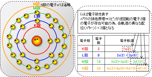 아래 그림과 같이 원자핵 주위에 전자 궤도가있다. 이 전자 궤도는 안쪽에서 K 껍질, L 껍질, M 껍질, N 껍질, ...라는 궤도의 종류가 있으며, 각각의 껍질에 들어가는 전자의 최대 수는 정해져있다.
