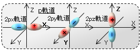 전자 껍질 외에 전자 궤도의 모양이 다른 몇 가지 패턴이있다. 이것은 전자가 원자핵을 중심으로 운동하는 궤도 (위치, 분포)의 것이고 전자 궤도라고하며, 위의 그림과 같은 몇 가지 궤도로 구분된다. (슈뢰딩거의 파동 방정식)