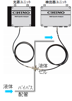 각종 액체의 바이 패스 배관에 액체 측정 용 셀을 설치하고 가시 광선에 의한 액체의 색상 차이, 색 농도 및 적외선 흡광도에 의한 액체 성분 농도를 동시에 실시간으로 측정합니다.