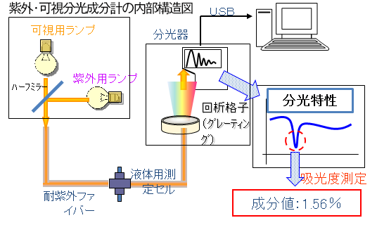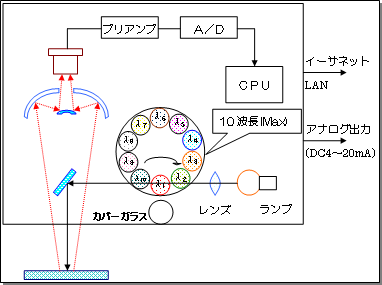 이 센서는 자외선 발광 용 중수소 램프 및 가시 광선 램프를 탑재하고 섬유를 통해 측정 대상에 조사하여 그 반사광을 다시 파이버를 통해 집광 빛을 연속 분광 1 차원 CCD 소자 에서 파장마다 흡광도를 측정합니다.