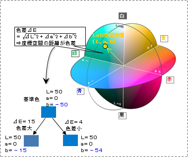 이것은 Lab의 각 값을 3 차원 좌표 공간으로 간주했을 때 (x, y, z → L, a, b)의 표준 색 좌표 (L, a, b)와 비교하는 색 좌표 (L ', a', b ')의 두 점 사이의 거리 (L)를, 색상 차이 2 색깔 사이의 색차 (= ⊿E)로 정의한 것입니다.