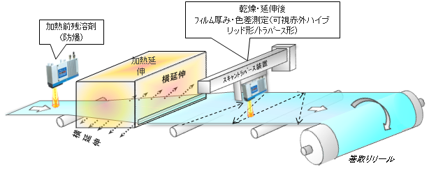 필름 생산 라인에서 건조 직후의 각종 성분 (두께, 수분, 잔류 용매 등), 적외선 흡광도에 따라 최대 3 성분 측정, 동시에 필름의 색상, 투명도를 가시 광선을 사용하여 실시간으로 측정하고 품질 관리, 제조 조건의 최적화를 실시합니다.
