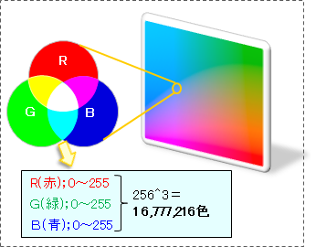 색의 3 위안 색상으로 R (빨강), G (녹색), B (파랑)이 있고, 각각 「0 ~ 255」계조로 농도를 나타냅니다.