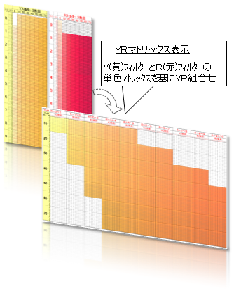 →YR 혼합 색깔 = 729 × 81 = 59,049 색 당사 색차 계에서 로비본도 측정에 사용되는 색 범위의 모든 필터의 조합 데이터를 데이터베이스 화하여 필터 측정 데이터와 사람의 색깔을 느낄 특성을 일치시킴으로써 로비본도 색상 측정을 실현시켜 있습니다。