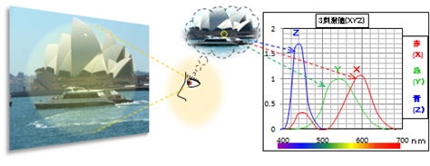 가시 광선은 파장에 따라 색의 분포를 가지고 있습니다. 실제로 사람이 색을 느끼는 것은, 파장 분포를 가진 가시 광선이 눈의 망막에있는 빨강 파랑 녹색의 3 가지 빛에 반응하는 자극을 뇌에 보내고 그것을 뇌가 색으로 인식하여 색을 감지합니다. 이 망막에서 나오는 빨강 파랑 녹색의 3 개의 자극 값을 3 자극 값 "X (λ), Y (λ), Z (λ)"라고합니다. 또한 X, Y 및 Z와 파장의 관계를 나타낸 것을 "등색 함수"라고 말합니다.