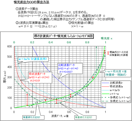 전항의 검량선 데이터는 실측치 Y과 2 (3) 파장 비율 계산에서 구한 흡광도 X 값과 수식을 1 ~ 3 차 다항식 식으로 요구하고 있습니다. 반면 요추 (람 베르트) 베일의 법칙에서는 Log 로그 연산 (두께 t에서 뗄 때에, t = - (1 / α) · Log (I) + β)에서 흡광도를 구하는 식으로되어 있습니다 . 다음으로 두께 측정시를 예로 요추 (람 베르트) 베일의 법칙에 근거 이론식에서 구한 흡광도와 당사에서 사용하고있는 "2 파장 비율 연산"을 사용 2 차 또는 3 차 회귀 연산 한 경우의 관계를 아래 그래프에서 보여줍니다. 이 모델 예제의 그림의 빨간색 화살표가 이론식의 오차를 나타냅니다. 그러나 실제로는 측정 범위가 품종 (로트)에 대해 어느 정도 정해져있어 그 범위에 곱게 회귀 연산을 실시하는 것으로, 사용상 문제가되지 않는 정도까지 오차를 줄일 수 있습니다. 또한 다중 회귀 연산은 각 파장 데이터의 로그를 취 (Logλn) 연산하고, 이론 식과 같은 연산 방법을 실시하고 있기 때문에,보다 회귀 연산 정밀도는 향상됩니다.