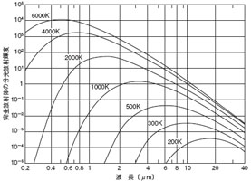 열 방사의 분포는 온도가 낮은 경우에는 긴 파장대로, 또한 온도가 높아 지는 것에 따라 짧은 파장대로 됩니다.