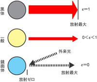 스스로는 전혀 방출하지 않고 주위에서 열 방사를 완전히 반사하는 물체의 방사율은 0에서 경면체라고합니다.