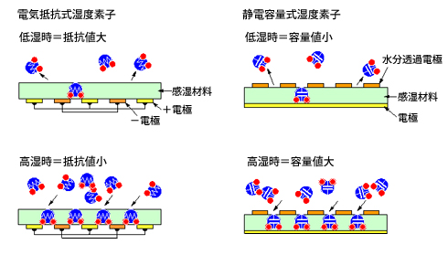 정전 용량 식은 고분자막의 양면에 진공 증착에 의해 얇은 그물망 모양의 전극을 설치 한 콘덴서의 형태로되어 있습니다. 즉, 수증기가 전극을 통해 고분자 막에 흡착하면이 콘덴서에 전기를 축적, 그 전기 용량 (커패시턴스)의 변화를 파악하는 구조입니다.