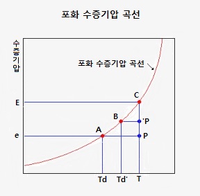 공기 중의 수증기 압력에 물의 포화 수증기압이 동일 온도에서 나타나며 수증기를 포함한 기체의 온도는 내려 가고, 수증기가 물이 시작할 때의 온도입니다.