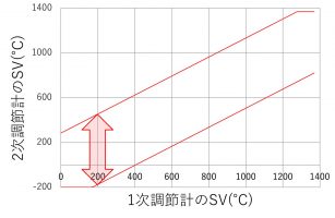 | 그림의 화살표는 1 차측 200 ℃에서 2 차측 SV의 변동폭을 보여줍니다.이 상 하한값의 계산 방법을 보여줍니다. 센서 규모가 1 차 2 차 모두 K 열전대의 -200 ~ 1370 ℃ 인 경우 200 ℃를 정상화하고{200 - (- 200)} ÷ 1570 × 100 = 25.4 (%)입니다. |
