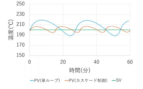 | 히터에 의한 가열과는 별도로 용기 내에서 물질이 화학 반응이 일어날때 발생하는 반응열이 용기 내의 온도를 상승시킬 수 있습니다.이러한 외란에 대한 제어성이 향상됩니다. | 온도 제어를 수행하기 위해 냉각수의 유량을 제어 할 수 있습니다. 이와 같이 온도 이외의 물리량을 이용하여 온도 제어를 할 경우에도 계단식 제어는 유효합니다. |