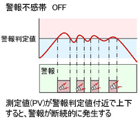 | 경보 불감대 | 측정치(PV)가 증감을 반복하고 있을 때, 경보의 발생과 해제가 자주 일어나는 것을 막는 기능.br>
