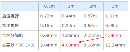 | 시야각 240 화소 (mm) | 0.16 | 0.32 | 0.65 | 0.98 | 1.63 | 3.26 | 6.53 |