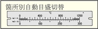 | 위치 별 자동 눈금 전환 | 2 종류의 측정 범위가 있었다 타점 식 기록계로 측정 장소를 두 그룹으로 나누어 각 그룹에 측정 범위를 주기적으로 바꾸는 예를 들어 6 점식 기록계로 1 ~ 3 점을 0 ~ 600, 4 ~ 6 점을 0 ~ 1200 ℃처럼 사용 ![]() |