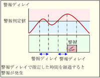| 경보 지연 | 측정 값이 경보 설정치를 넘어도 즉시 경보가 발생하지 않고, 경보 지연 시간을 경과하면 경보를 발생시키는![]() |