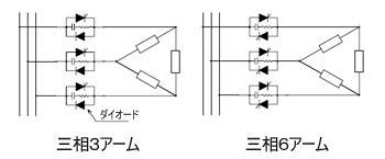 삼상의 경우, 기본적으로 단상 사이리스터 레귤레이터 × 3 개 6 암 (게이트 = 암이 6 개)이지만, 또 다른 3 대 (게이트 = 암이 3 개)의 2 종류가 있습니다. 6 암은 3 암에 비해 제어성이나 변압기 부하와의 매칭, 유출 고조파 전류의 저감 등의 장점이 있기 때문에, CHINO제픔의 경우는 6 암을 표준 사양으로하고 있습니다.